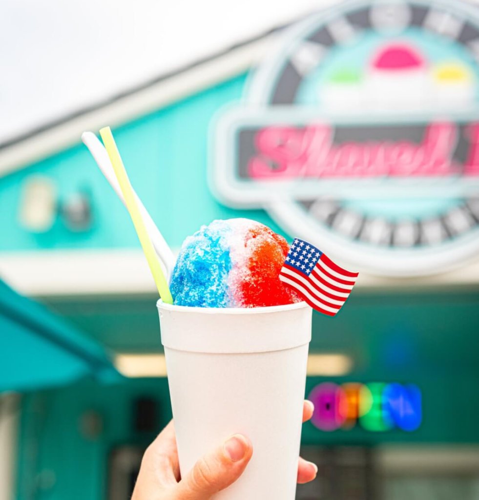 Trendy stand serving shaved ice with multiple flavor and topping options, including Kool-Aid pickles.