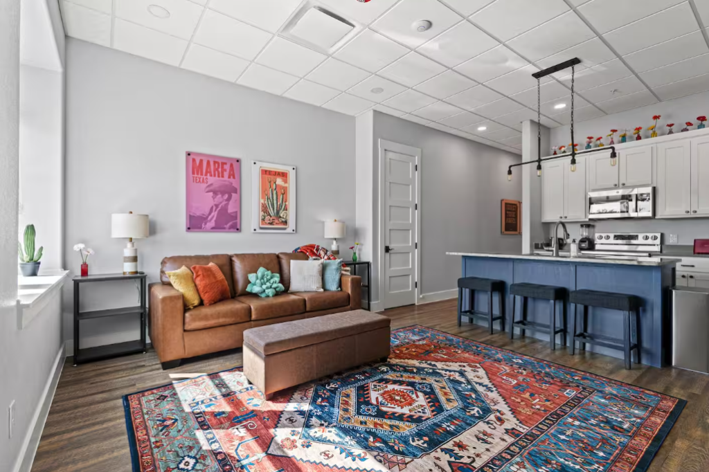 Escape to the Tejas Loft on historic Main Street, a vibrant, country club–inspired space filled with bold décor, bright accents, and unmistakable Denison flair. Featuring a king bedroom, queen sleeper sofa, smart TVs, fast Wi-Fi, a fully stocked kitchen, and in-unit laundry, this loft comfortably sleeps four and is ideal for couples, friends, or remote work stays.