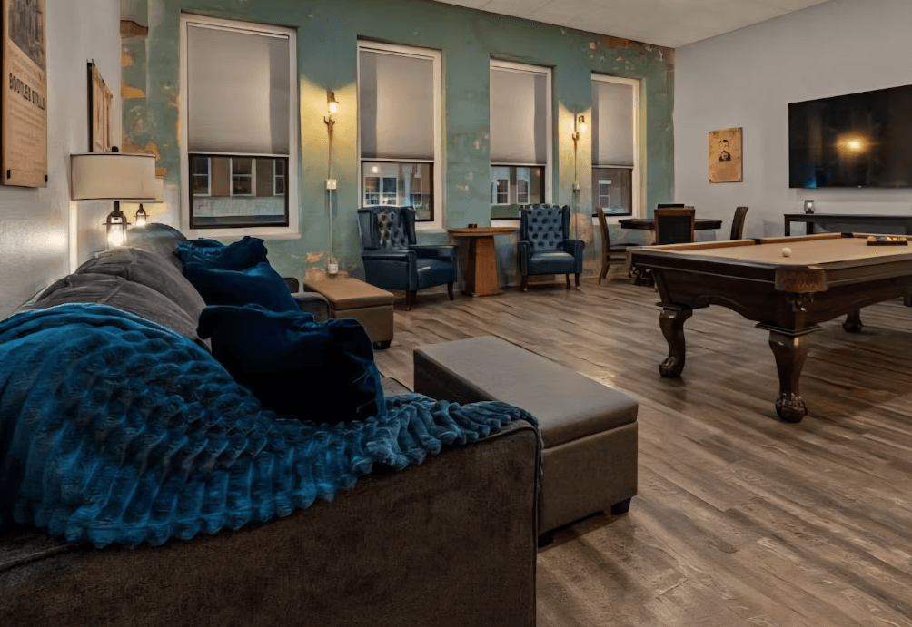 Step into the Speakeasy Loft, a Prohibition-era inspired hideaway on historic Main Street that blends vintage character with modern comfort. This spacious loft sleeps up to seven guests and features a king bedroom, multiple sleeper sofas, pool and poker tables, an 85” smart TV, and a fully stocked kitchen—perfect for game nights and group getaways.
