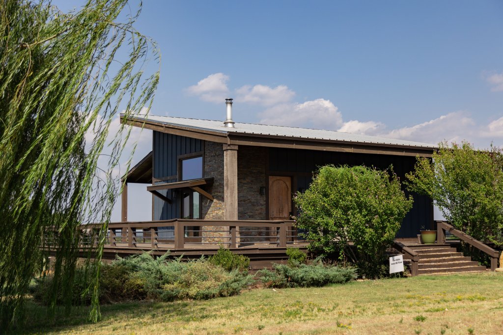 This open-concept cabin sits on 17 scenic acres with a 4-acre pond and sweeping views of the Texas/Oklahoma countryside. Guests can relax indoors or out, spot local wildlife, and enjoy access to shared amenities like kayaks, hiking trails, and pond fishing. The cabin sleeps 5.